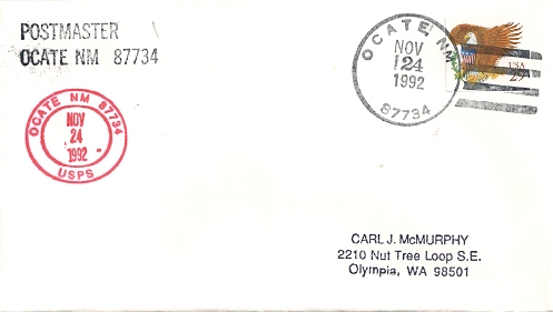 | Two different hand cancellations: "OCATE, NM 87734 NOV 24 1992" and "OCATE, NM 87734 USPS NOV 24 1992". |