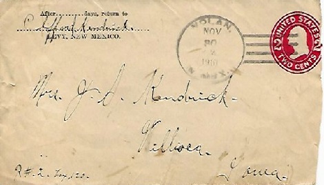| Hand cancellation: "NOLAN, N. MEX. NOV 30 1910". [TPC] |