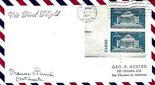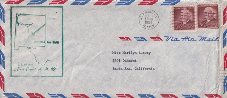 | This cacheted cover is for the first air mail flight A. M. 29 to El Paso. Machine cancellation: "ALAMOGORDO, N.MEX. SEP 1 1954". |