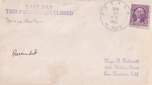 | Hand cancellation: "PETACA, N. MEX. JAN 16 1936". |