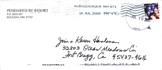| Hand cancellation: "ROCIADA, NM 87742 USPS JUL 10 2009". |