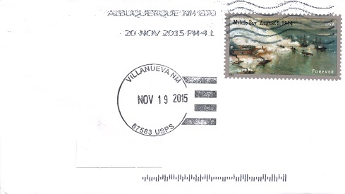 | Hand cancellation: "VILLANUEVA, NM 87583 USPS NOV 19 2015". |