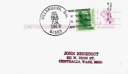 | Hand cancellation: "VILLANUEVA, NM. 87583 JUL 25 1969". |
