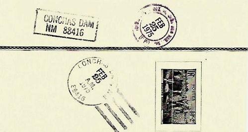 | Two different hand cancellations on insert: "CONCHAS DAM, NM 88416 FEB 25 1975" and "CONCHAS DAM RUR. STA., TUCUMCARI, N. MEX. USPO FEB 25 1975". |