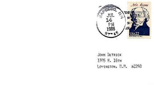 | Hand cancellation: "SAPELLO, NM 87745 JUL 14 1986". |
