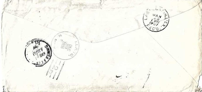 | Hand cancellation: "EAST LAS VEGAS, N.MEX. AUG 7 1906 ( 1 )". Has "RETURNED TO WRITER" pointing hand auxiliary marking. [TPC] |