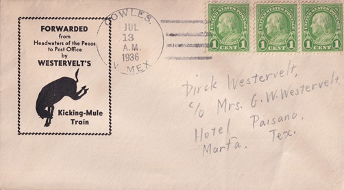 | Hand cancellation: "COWLES, N. MEX. JUL 13 1936". |