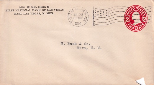 | Machine flag cancellation: "EAST LAS VEGAS, N.MEX. JUL 28 1914". |