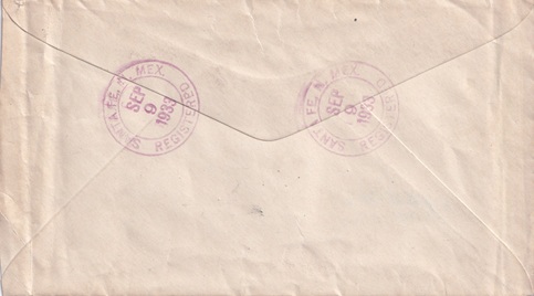 | Hand cancellation on back: "REGISTERED, SANTA FE, N. MEX. SEP 9 1933". Has "REGISTERED NO." auxiliary marking on front. |