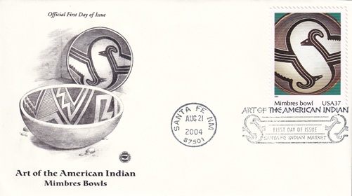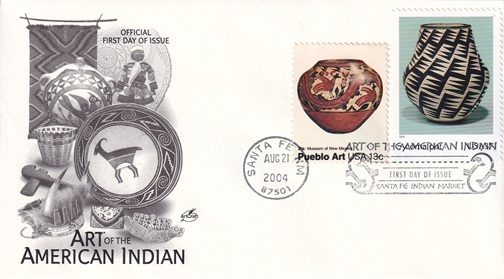 | These six cacheted covers are for the first day of issue of the Art of the American Indian 37 cents postage stamps series. Special machine pictorial & slogan cancellations: "SANTA FE, NM 87501 AUG 21 2004 | ART OF THE AMERICAM INDIAN FIRST DAY OF ISSUE SANTA FE INDIAN MARKET |". |