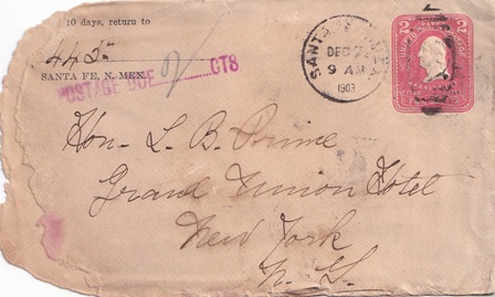 ![]() | Hand cancellation: "SANTA FE, N.MEX. MAR 8 1903 ( 1 )". Has "NOT IN DIRECTORY" and "Unclaimed RETURNED TO WRITER" pointing hand auxiliary markings. [TPC] |