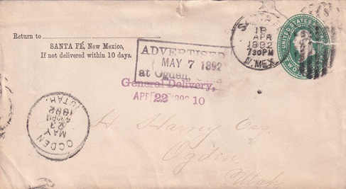 ![]() | Hand cancellation: "SANTA FE, N.MEX. APR 18 1892". Has "General Delivery, APR 22 1892 10" and "ADVERTISED MAY 7 1892 at Ogden, Utah" auxiliary markings. [TPC] |