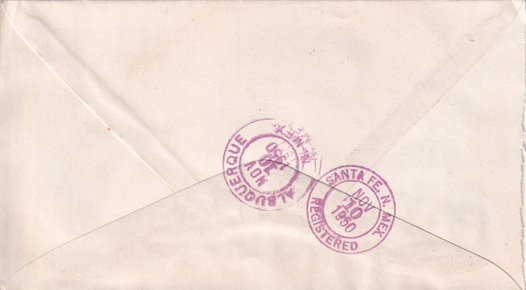 | Hand cancellation on back: "REGISTERED, SANTA FE, N. MEX. OCT 30 1934". Has "REGISTERED NO." auxiliary marking on front. |