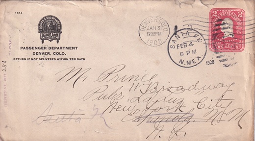 ![]() | Hand cancellation: "SANTA FE, N.MEX. FEB 4 1908 ( 1 )". [TPC] |