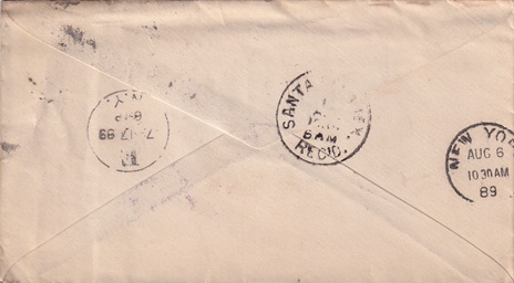 ![]() | Hand cancellation on back: "REC'D., SANTA FE, N.MEX. AUG 19 1889". Has "N.Y. I.D." pointing hand auxiliary marking on front. [TPC] |