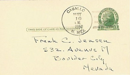 | Hand cancellation: "CABALLO, N. MEX. MAY 10 1950". |