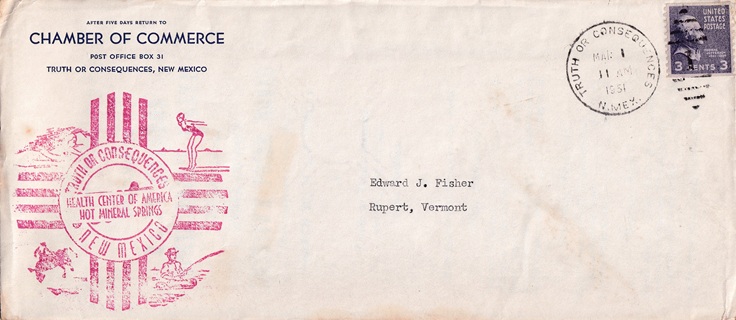 | Three hand cancellations: "TRUTH OR CONSEQUENCES, N.MEX. MAR 1 1951 | 1 |". |