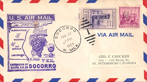 | This cacheted cover is for the first air mail flight A.M. 29 to El Paso. Hand cancellation: "SOCORRO, N. MEX. MAR 31 1950 | 1 |". |
