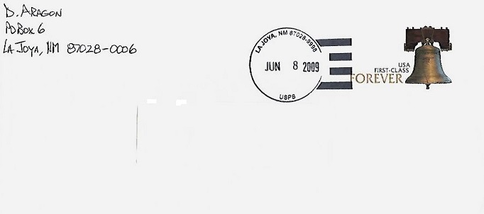 | Hand cancellation: "LA JOYA, NM 87028-9998 USPS JUN 8 2009". |