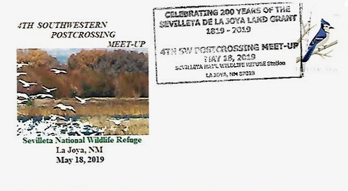 | Special hand slogan cancellation: "SEVILLETA NAT'L WILDLIFE REFUGE Station, LA JOYA, NM 87028 MAY 18, 2019 | CELEBRATING 200 YEARS OF THE SEVILLETA DE LA JOYA LAND GRANT 1819 - 2019 4TH SW POSTCROSSING MEET-UP |". |