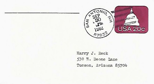 | Hand cancellation: "SAN ANTONIO, NM 87832 SEP 30 1982". |