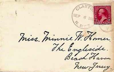 | Hand cancellations on front & back: "CLAYTON, N.MEX. DEC 6 1906". Has "RETURN TO WRITER" pointing hand and "Unclaimed" auxiliary markings on front. [TPC] |