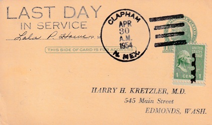 | Hand cancellation: "CLAPHAM, N. MEX. APR 30 1954". |