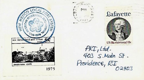 ![]() | This cover features the New Mexico Local Post System "Montezuma Castle" 5 cents postage stamp. Local post hand pictorial cancellation: "NEW MEXICO LOCAL POST SYSTEM AMERICAN REVOLUTION BICENTENNIAL 1776-1976". USPS machine cancellation: "ALBUQUERQUE, NM 871 JUN 18 1977". |