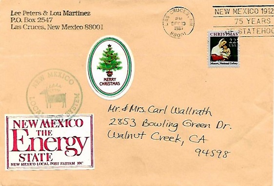 ![]() | This cover features the New Mexico Local Post System "New Mexico the Energy State" 10 cents postage stamp. Local post hand pictorial cancellation: "NEW MEXICO LOCAL POST SYSTEM". USPS machine slogan cancellation: "LAS CRUCES, NM 88001 DEC 10 1987 | NEW MEXICO 1912-1987 75 YEARS OF STATEHOOD |". |