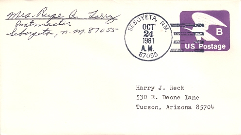 ![]() | Hand cancellation: "SEBOYETA, NM. 87055 OCT 24 1981". |