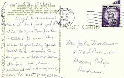 ![]() | Hand cancellation: "MILAN RUR. STA., GRANTS, N. MEX. JUL 20 1960". |