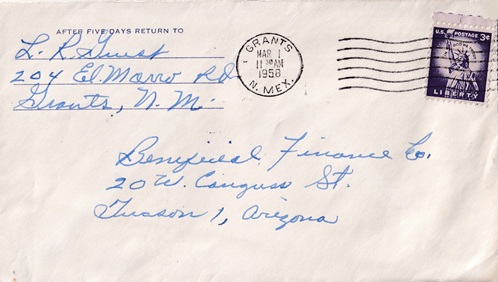 | Machine cancellation: "GRANTS, N.MEX. MAR 1 1958". |