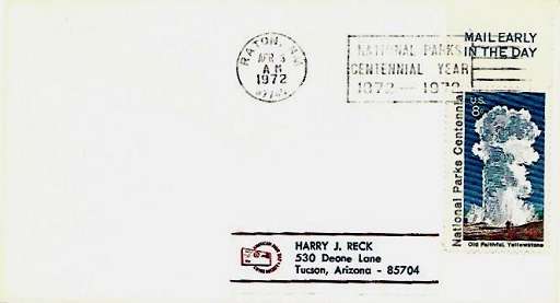 | Machine slogan cancellation: "RATON, NM 87740 APR 3 1972 | NATIONAL PARKS CENTENNIAL YEAR 1872 - 1972 |". |