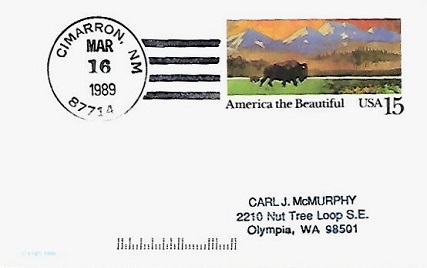 | Hand cancellation on front & back: "CIMARRON, NM 87714 MAR 16 1989". |