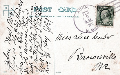 | Hand cancellation: "ADEN, N. MEX. FEB 9 1911". [TPC] |