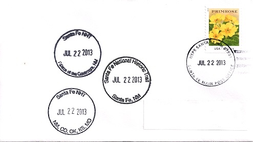 Hand postal cancellation: "SANTA FE MAIN POST OFFICE. SANTA FE, NM 87501 USPS JUL 22 2013". Passport cancellation: "Santa Fe National Historic Trail. Santa Fe, NM. JUL 22 2013".