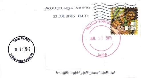 Hand postal cancellation: "WATROUS, NM 87753 JUL 11 2015" Passport cancellation: "Santa Fe NHT. Fort Union National Monument, NM. JUL 11 2015".