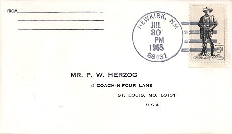 | Hand cancellation: "NEWKIRK, NM 88431 JUL 30 1965". |
