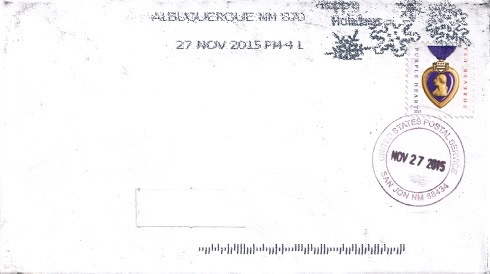 | Hand cancellation: "SAN JON, NM 88434 UNITED STATES POSTAL SERVICE NOV 27 2015". |