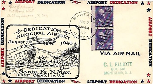 | Hand cancellation: "SANTA ROSA, N. MEX. SEP 1 1943 ( 1 )". Has "FEE CLAIMED BY OFFICE OF FIRST ADRESS" auxiliary marking. |