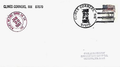 | Two different hand cancellations: "CLINES CORNERS, NM 87070 JAN 20 1987" and "CLINES CORNERS RUR. STA., MORIARTY, NM USPO JAN 20 1987". |