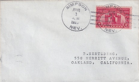 ![]() | Hand cancellation: "SIMPSON, NEV. AUG 1 1927". |