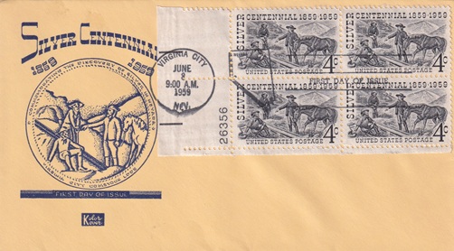 Four special hand pictorial & slogan cancellations: "VIRGINIA CITY, NEV. JUN 8 1959 | FIRST DAY OF ISSUE |".