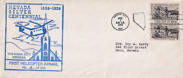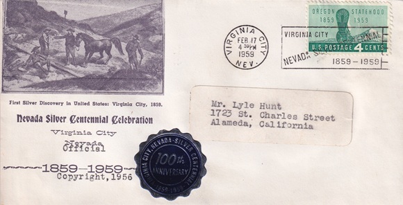 Special machine slogan cancellation: "VIRGINIA CITY, NEV. FEB 17 1959 | VIRGINIA CITY   NEVADA SILVER CENTENNIAL 1859 - 1959 | ".