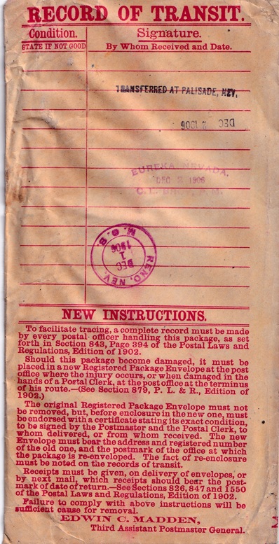 ![]() | Hand cancellation on back of "U. S. P. O. D. Registered Package": "C. L. BROY, P. M., EUREKA, NEVADA. DEC 2 1906". |