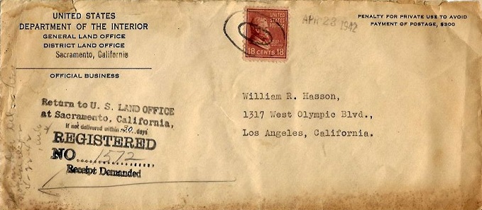 | Hand cancellation on back: "REGISTERED, SACRAMENTO, CALIF. APR 21 1942". Has "REGISTERED NO. _ _ _ _ _ Receipt Demanded" auxiliary marking on front. |