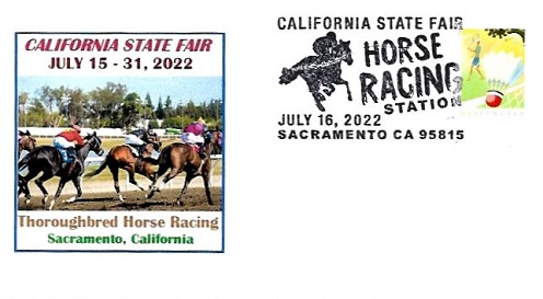 | Special machine pictorial cancellation: "CALIFORNIA STATE FAIR HORSE RACING STATION, SACRAMENTO, CA 95815 JULY 16, 2022". |