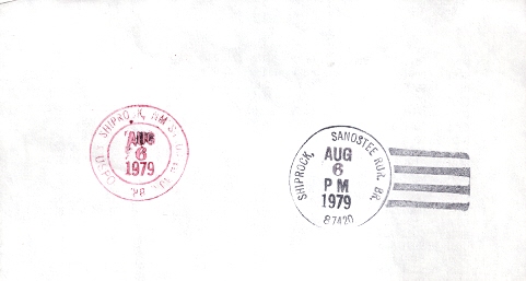 | Two different hand cancellations on insert: "SANOSTEE RUR. BR., SHIPROCK 87420 AUG 6 1979" and "SANOSTEE RUR. BR., SHIPROCK, NM USPO AUG 6 1979". |