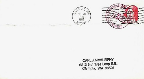 | Two different hand cancellations: on front "TOHATCHI, NM 87325 AUG 18 1987", and on back "TOHATCHI, N. MEX. AUG 18 1987". |