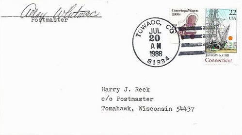 | Hand cancellation: "TOWAOC, CO 81334 JUL 20 1988". |